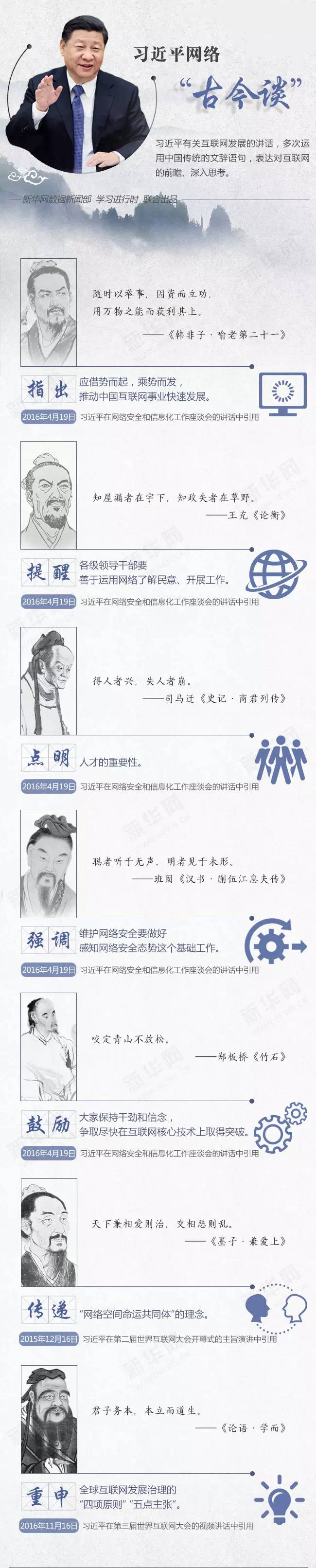 互联网与古诗文,居于时间轴的两端,然而古今之理相通。习近平有关互联网发展的讲话,多次运用中国传统的文辞语句,表达对互联网的前瞻、深入思考。古老与新潮,穿越时空的碰撞,淬炼出智慧的火花。