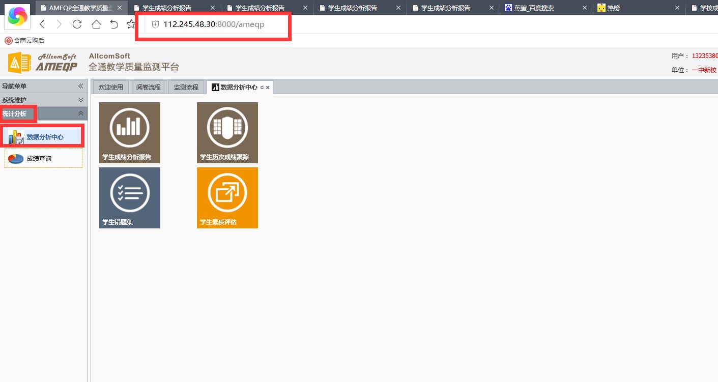 3、选择左侧统计分析-数据分析中心,点击学生成绩分析报告。 4、点击选择考试