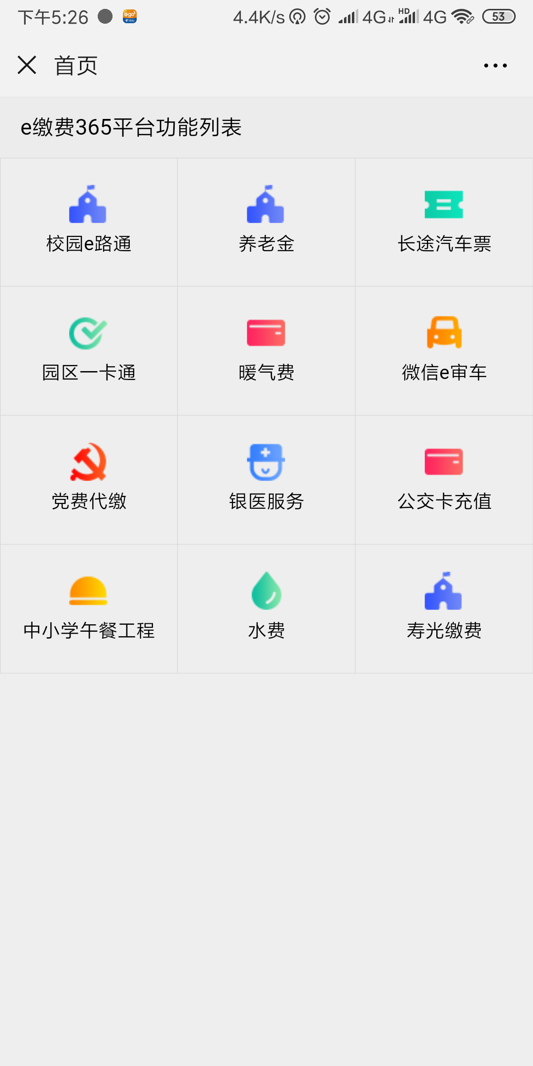 图1 1、扫描成功后,点击【业务办理】,选择e缴费365,随后选择校园e路通,页面如图1所示,进入下一页菜单,再如图2 所示:选择【缴费】菜单, 【城市】下拉列表中选择【泰安】,【单位】下拉列表中选择【米兰体育线上平台-米兰体育(中国) 】,输入编号(学生身份证号)、输入姓名,点击【查询】。