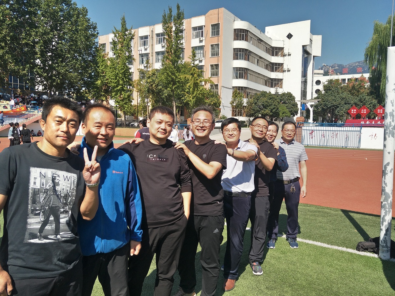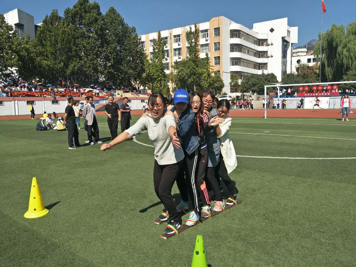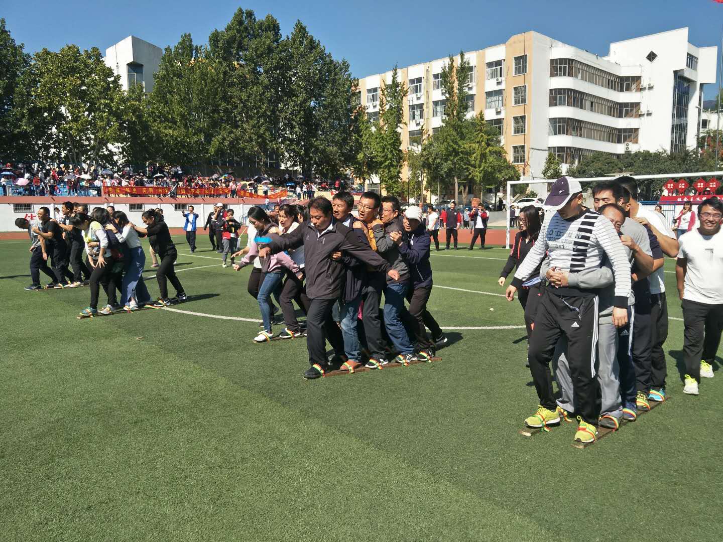 泰安一中2018年教职工运动会于9月29-30日隆重举行,本次运动会设置了男女老年组、中年组和青年组三个组别。来自全校的400多名教师分别参加了男女“足球定点射门”、“实心球投准”、“篮球定点投篮”3个单项项目和“4×100米”接力、“5人踩木屐接力”、“10人单脚火车跑得快”3个集体项目的比赛。