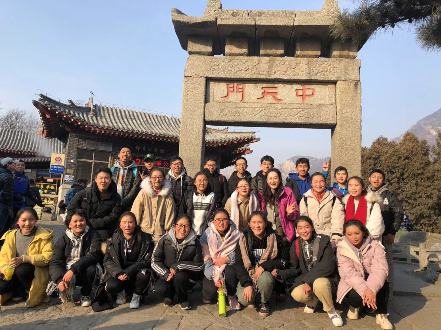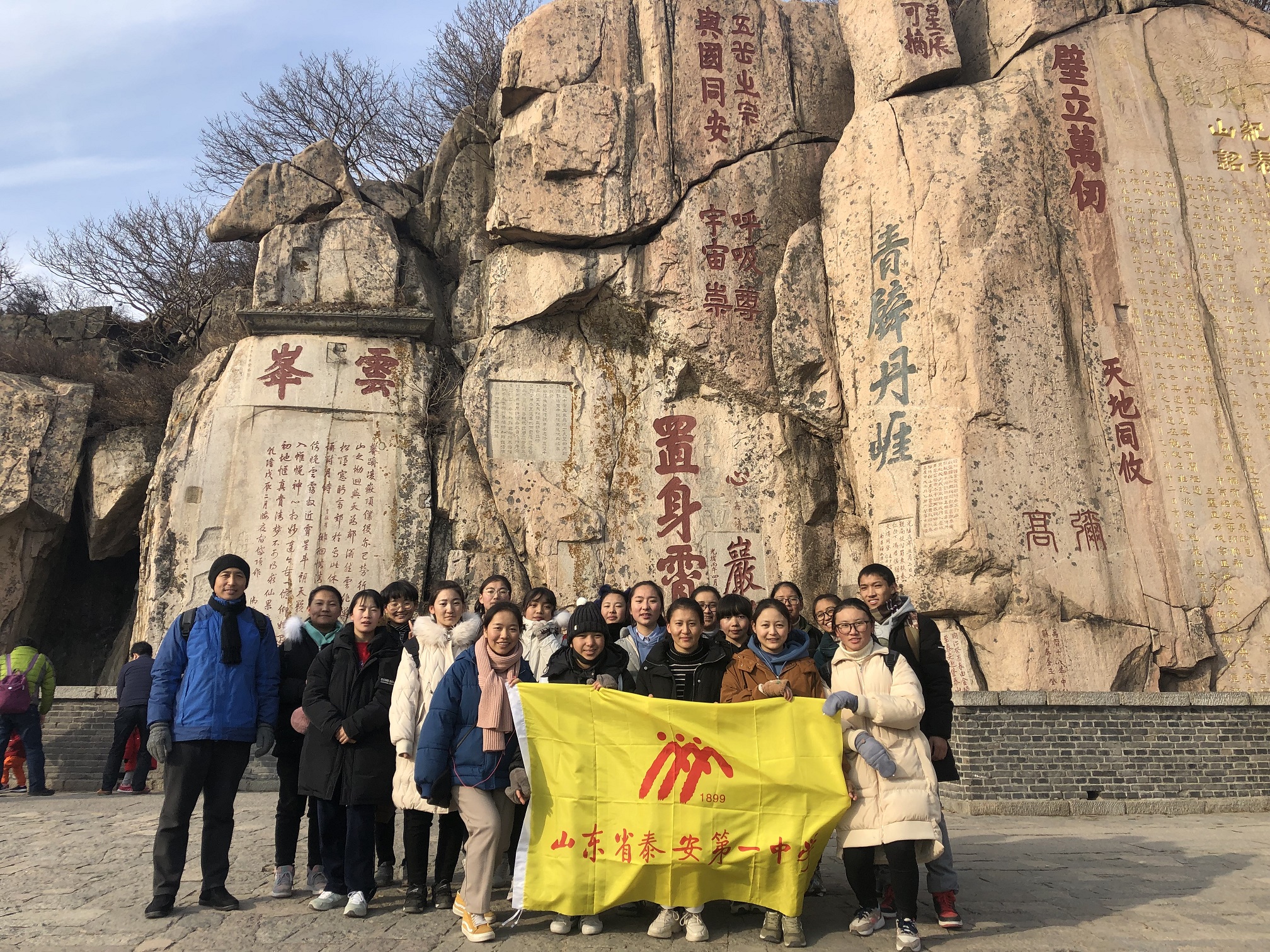 同学们从玉皇顶下来经过并参观了泰山非常著名的景点——大观峰。大观峰是山东泰安的著名风景名胜之一,布满了历代题勒,其中最著名的是唐玄宗于开元十三年(725)登封泰山时御制御书的《纪泰山铭》,俗称“唐摩崖”。明代文学家王世贞评价说:“穹崖造天铭书,若鸾飞舞于烟云之表,为之色飞。”师生在此许下了2019年的庄重的誓言“2019,一起拼搏,一起奋斗!”