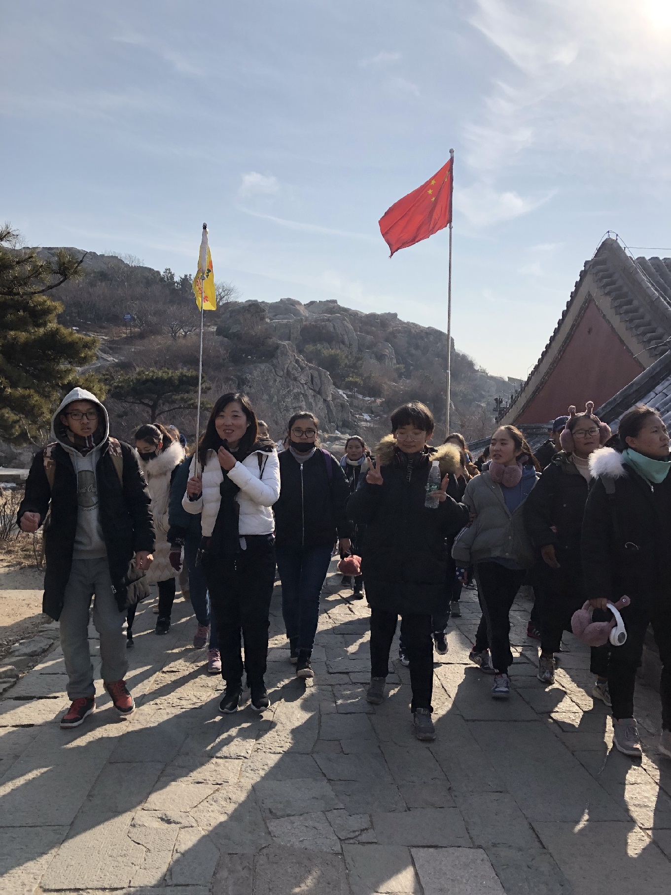 参观完斗母宫后,同学们又继续开始攀登泰山,此时距离泰山的中天门也已行程过半。快看!中间那位穿蓝上衣的同学,在背着自己书包的同时,还在为其他略显疲惫的同学拿起了书包跨在身上继续前行,这种助人为乐的精神值得我们学习,在这寒冷的冬天里送来了丝丝温暖。