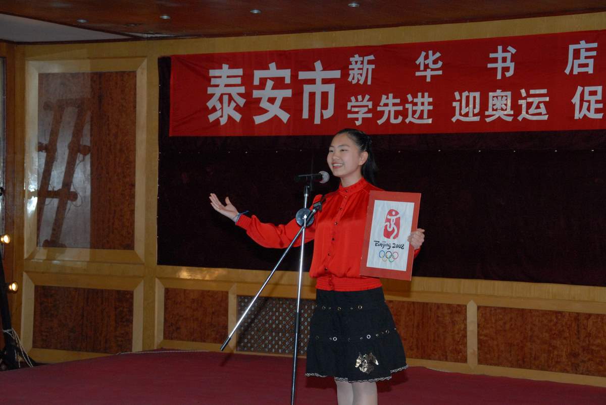 2008420下午,泰安市“新华书店杯”“学先进、迎奥运、促和谐”演讲(讲故事)比赛在市新华书店隆重举行,我校高二学生刘雅琦和高一学生郭明明双双获得一等奖。刘雅琦同学演讲的《我愿做一枚“中国印”》,以其高昂的激情,富有感染力的声音,赢得了评委的一致好评,获得全场最高分9.74分。刚刚在山东省科技创新大赛荣获金奖,载誉归来的高一选手郭明明,她演讲的《秋水》感情真挚、深沉,令现场观众、评委产生心灵的共鸣,无不为之动容。