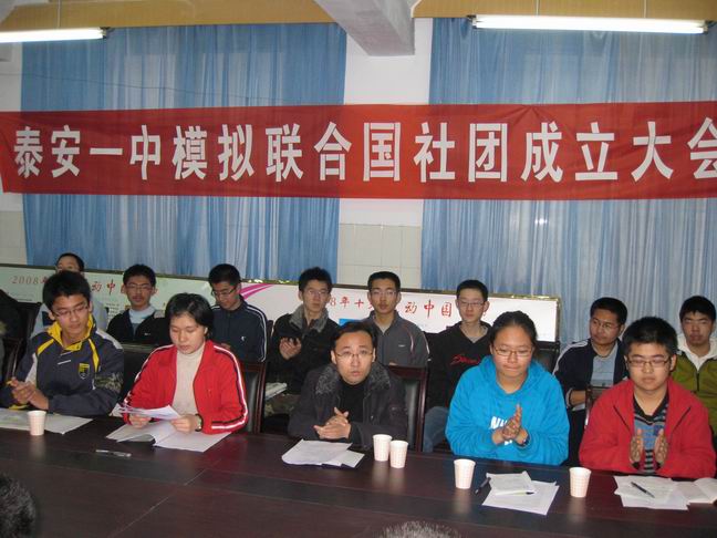 2009321日,泰安一中模拟联合国学生社团在泰安一中团校召开了成立大会,会议由高一学生会主席封蔚然同学主持。模拟联合国学生社团团长代表社团成员宣读了社团宗旨、章程、活动计划。李秀笃副校长、张玉良副主任到会表示了热烈祝贺。成立仪式结束后,模拟联合国学生社团开展了第一次活动,活动的议题是“联合国千年计划之环境保护”。指导教师刘元国老师对活动作了有针对性的指导和点评。