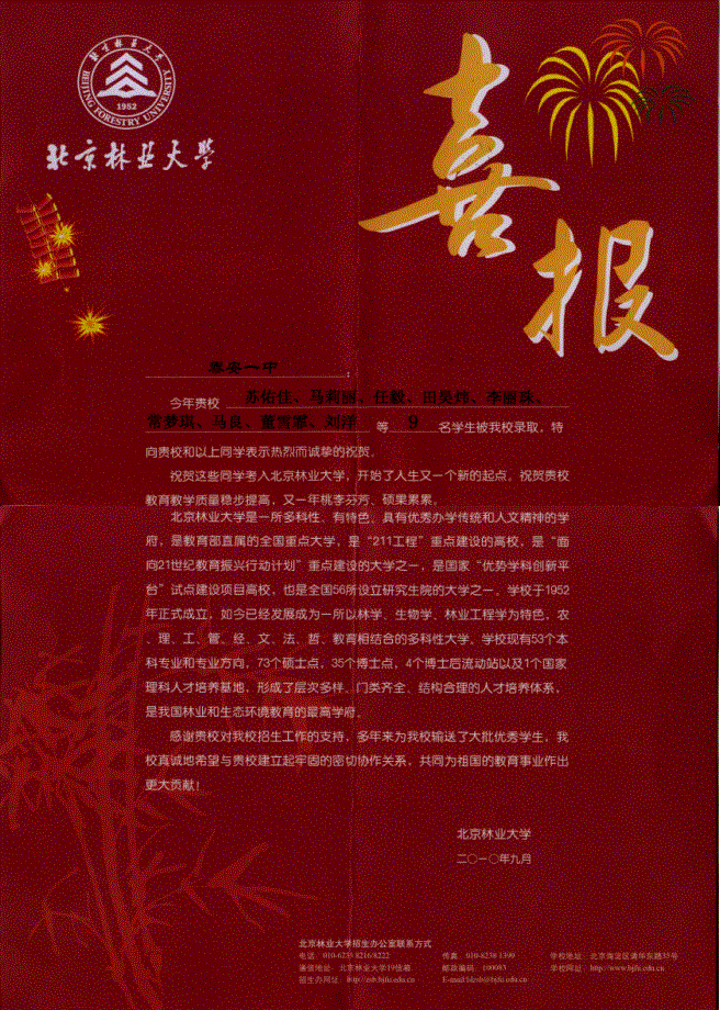 北京林业大学致我校喜报