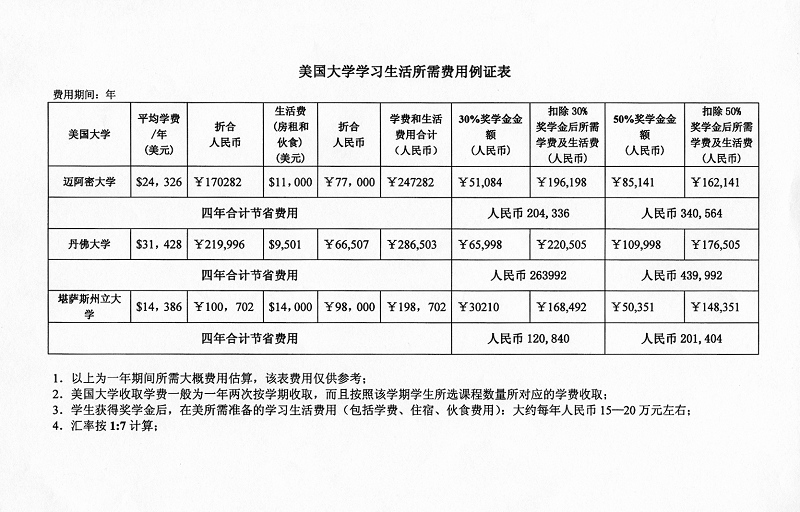 通过一年学习并顺利完成美国大学规定学分的学生,将进入美国大学继续学习。根据学校不同,大约每年需人民币20万元左右。