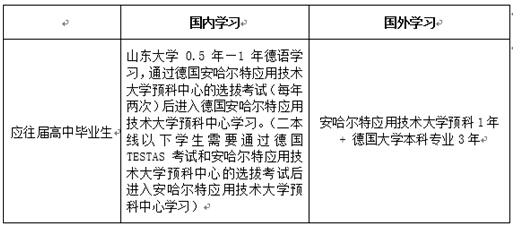 2015山东大学高中生攻读德国本科预科项目 (官方审批号:20142001) ——德国安哈尔特大学预科项目 承办单位:山东大学土建与水利学院 一、山东大学德国大学项目简介: 山东大学是一所历史悠久、学科齐全、学术实力雄厚、办学特色鲜明,在国内外具有重要影响的教育部直属重点综合性大学,是国家“211工程”和“985工程”首批重点建设的高水平大学之一。 山东大学安哈尔特应用技术大学预科项目经学校批准后正式开始招生。学院拥有一流的师资、专业的管理队伍,安排有舒适的教室和宿舍,对在学学生实行奖学金制度,全力培养学生去国外深造,给学生提供一流的高等教育机会。 安哈尔特应用技术大学预科面向国外招收应往届高中毕业生,学生需要参加安哈尔特应用技术大学在山东大学组织的选拔考试,合格后方可到安哈尔特应用技术大学预科中心学习。安哈尔特应用技术大学预科中心(网站链接:)有丰富的经验帮助学生申请德国大学。安哈尔特应用技术大学预科一年毕业后,可以申请德国公立大学,全德语授课,中国教育部学位认证。学生在国外可选择自己喜欢的专业。 二、为什么选择去德国: 1、德国民富国强:德国人均GDP是4万美元。 2、德国有89位诺贝尔奖获得者。 3、德国是世界一流强国,是重要的工业、贸易大国,世界第一大贸易顺差国, GDP占欧盟的三分之一。 4、德国教育高度发达,公办大学免收学费,文凭含金量世界居先,是留学性价比最高的国家之一。 5、德国大学国际化水平名列前茅,奥地利、瑞士都是德语国家。 6、德国在汽车、电子、化工、生物、建筑、设计、环保、机械等领域领先世界, “德国制造”享誉世界,专利申请量占全球的20%。 7、德国的技术创新和高科技产品的出口在世界领先地位, 德国申请的专利占世界专利市场的20%,中国高端医疗器械一半以上来自德国。 8、 德国是最安全的留学国家之一,德国成为欧洲第一个允许移民的国家,受过高等教育的外国留学生移民德国成为梦想。 9、德国大学毕业后就业前景好,德国连续10年成为中国在欧洲最大的投资伙伴, 在中国立足的德国企业已达5000多家,德国企业急需大量具有留德背景的中国 人才。 10、德国政府允许留学生有4个月的合法打工时间。 三、项目优势: 1.山东大学批准的涉外培训项目 该项目属德国团审项目,团体APS审核,无需德国大使馆面签,签证有保障。 2.无需DAF(德福)考试,德语零基础学习。 3.丰富办学经验,提供可靠的留学途径 4. 高校名师授课,教学质量有保障 项目的语言强化及专业课程的全部师资力量均为高校教师,让学生享受一流的师资并提前适应国外高校学习方式。 5. 山大德语强化学习,达到德国安哈尔特应用技术大学预科录取要求 项目以专业的教材、严格的考勤、大课时量为特点,每学期高达510课时(每学年高达1020课时)的全日制授课,并配有定期的教师反馈调查与教学效果调查,帮助学生达到德国安哈尔特应用技术大学预科录取要求。 6. 严格管理,统一住宿 该项目在山东大学校内上课,统一安排就餐与住宿;所有班级均配备专职辅导员,日常实行半军事化管理;每天全日制学习,每天有早读和晚自习;每月有月考制度和家长会制度,优秀学生有200元至1000元不等的奖励; 7.签订培养协议,保障学生权益 入学时与学生签订培养协议,通过考试后,获得德国安哈尔特应用技术大学预科录取。 8. 留学费用低、性价比高 德国大学第一年预科学费12500欧元。德国大学本科三年、硕士两年免学费;每年生活费用4-5万元人民币; 9. 有德国就业机会 德国大学毕业后即可无条件获得1年工作签证用于找工作。德国企业急需大量具有留德背景并熟练掌握德语及专业技术的中国人才。 10. 回国就业 在中国立足的德国企业已达5000多家,德国留学回国人员所学专业技术先进,工资待遇较高,提供更大的职业空间。 四、德国公立大学简介 安哈尔特应用技术大学预科毕业后成绩优秀的学生可申请德国所有公立大学 马格德堡大学: 马格德堡大学是位于有着1200 年历史的帝王主教之城——马格德堡,众多的理工类专业更居德国大学前列。该校共开设专业101个,拥有上万学生。作为马格德堡教学科研的中心,该校的影响力不断增长。目前已发展成为计算机科学(在计算机领域曾多次排名第一)、经济科学机械制造和文化的中心。专业有企业经济学,工商管理,生物,化学和加工工程,计算机视觉学,经济和金融,电子能量系统,电子技术,能量技术,信息学,信息技术,文化研究,艺术类,教师,机械制造,机械工程,机械和过程工程,医学,分子和结构合成,物理,心理学,质量、系统技术和系统控制,环境和能量技术,化学工程,国际经济,经济工程学,物流,经济工程学(机械制造),经济教育学等80多个专业。 安哈尔特应用技术大学: 安哈尔特应用技术大学为萨克森-安哈特州最具影响力的应用技术大学,有120年历史,距离柏林约45分钟车程。该校现有8000多名学生。师资力量雄厚,教学设施先进,由德绍、贝恩堡、科滕三大校园组成,其优势专业为建筑学、景观建筑、机械、设计、经济贸易、生物医学、食品科学、农业、景观建筑和环境规划、自然保护和景观设计、食品营养学、企业管理、国际贸易、房地产经济、经济法、建筑、设施管理、地质信息学、测量学、设计、信息学、信息管理、生物医学工程、电子技术和信