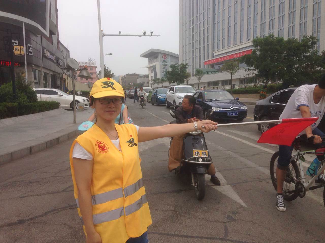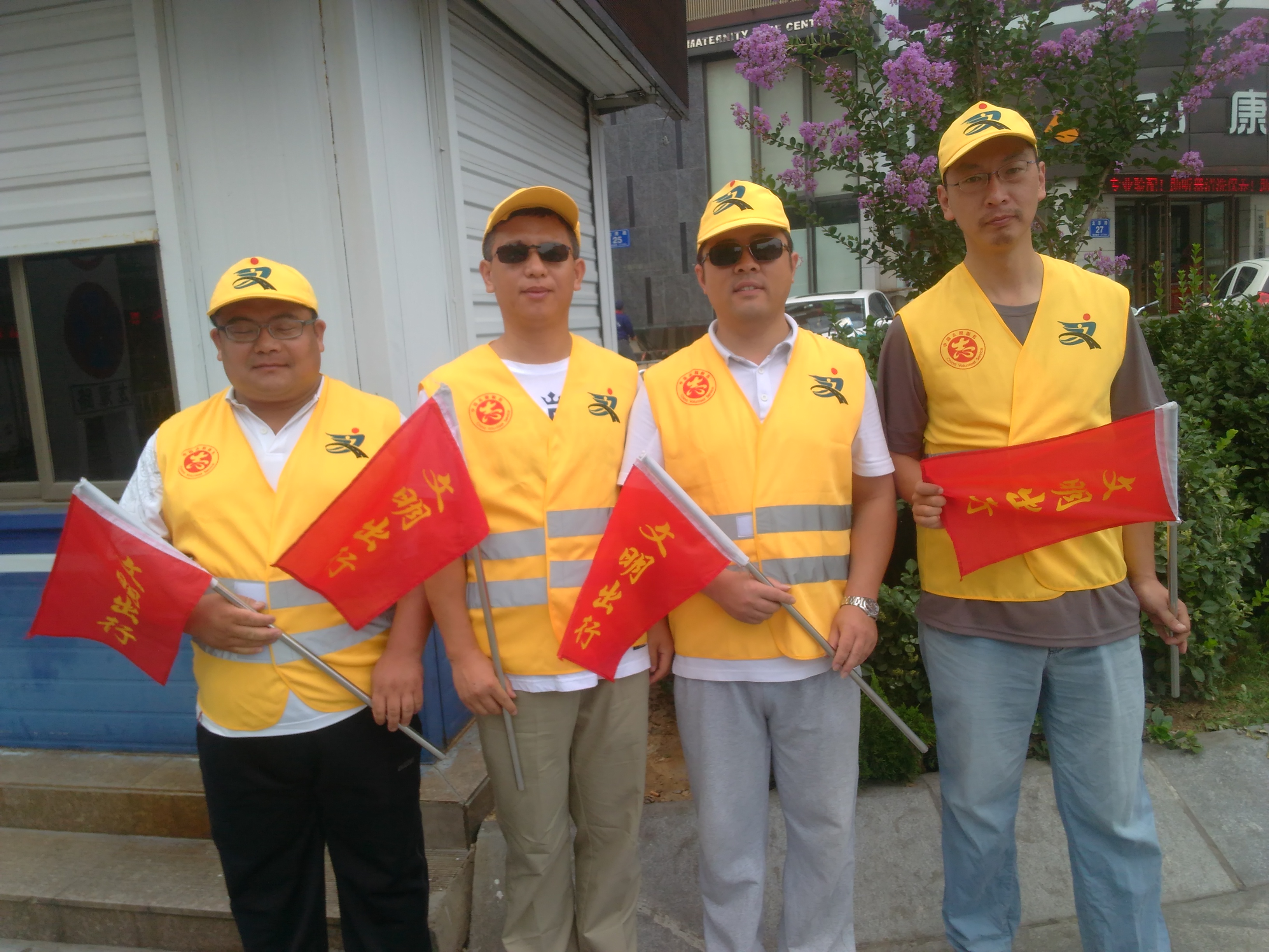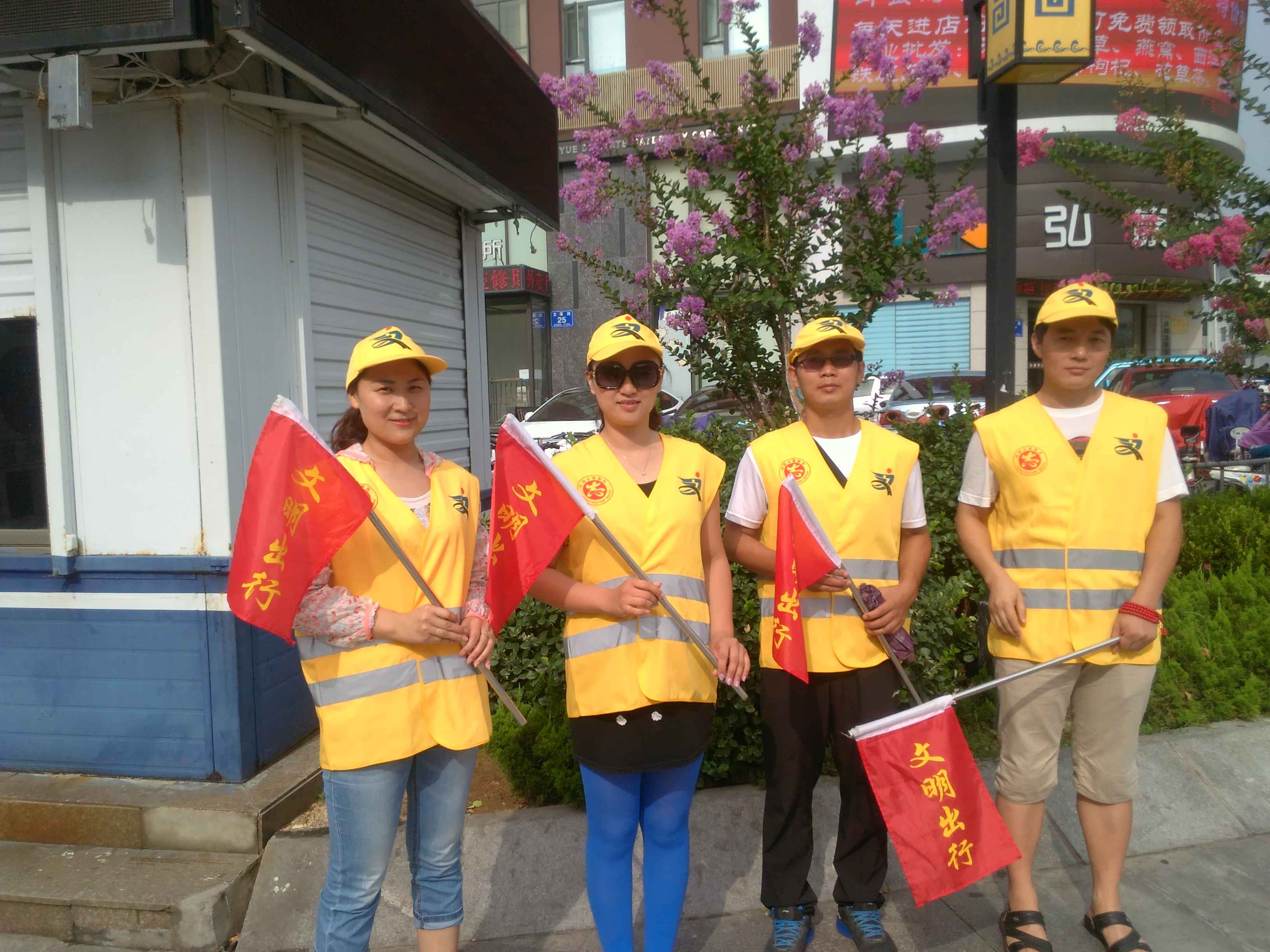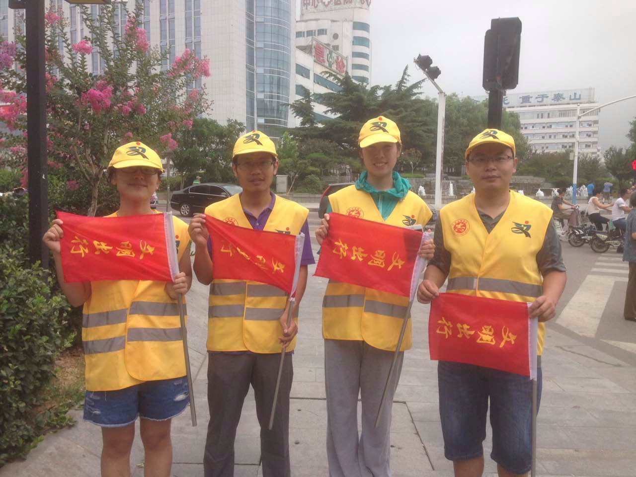 今天,是我校文明交通志愿者执勤的第一天,有8名文明交通志愿者分别于7:20-9:0017:00-18:30分两组在东岳大街与奈河东路路口执勤。今天上午7:10,第一组4名交通志愿者身着统一的黄马甲,头戴黄色太阳帽,手持交通指挥旗,开始上街引导交通。在接近两个小时的执勤过程中,4名教师中间未曾休息,冒着高温酷暑一直坚守岗位,尽职尽责,主动引导市民过马路走斑马线,不闯红灯,配合交警维护路口交通秩序,教育行人遵守交通规则。活动过程中,共劝阻闯红灯、越线等不文明交通行为60余起,积极向市民宣传交通法规80余次。