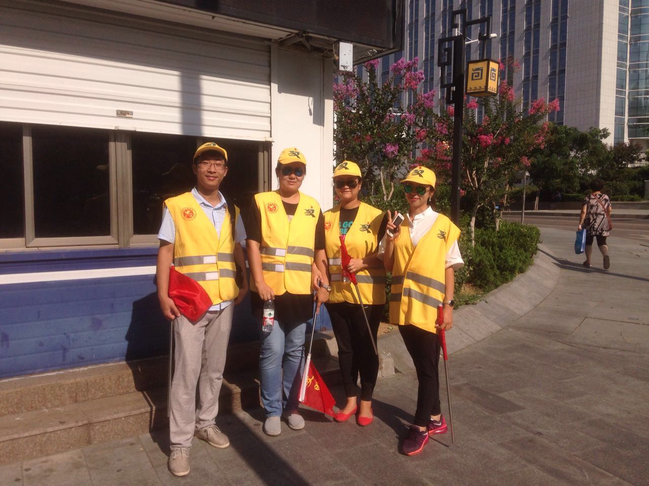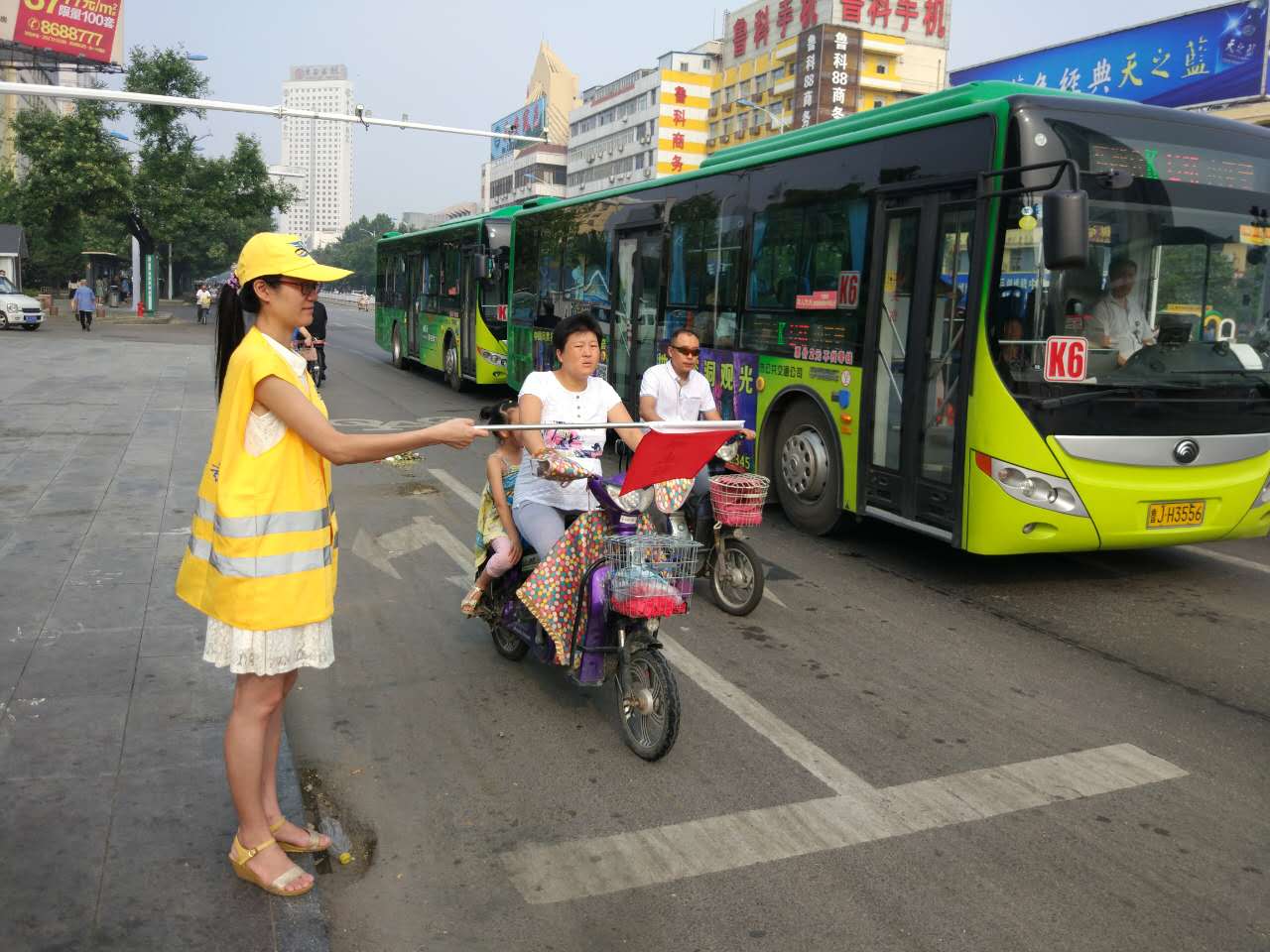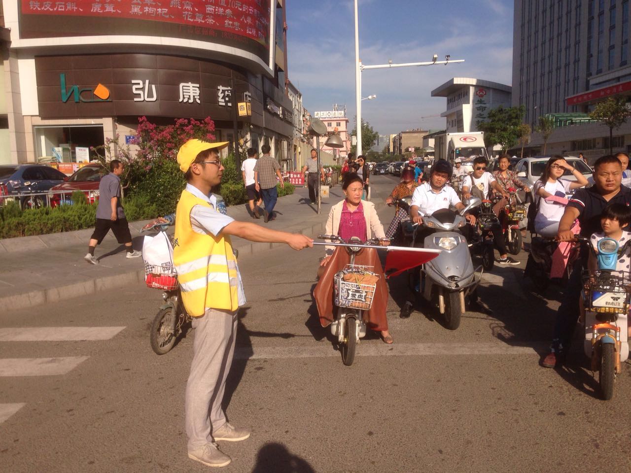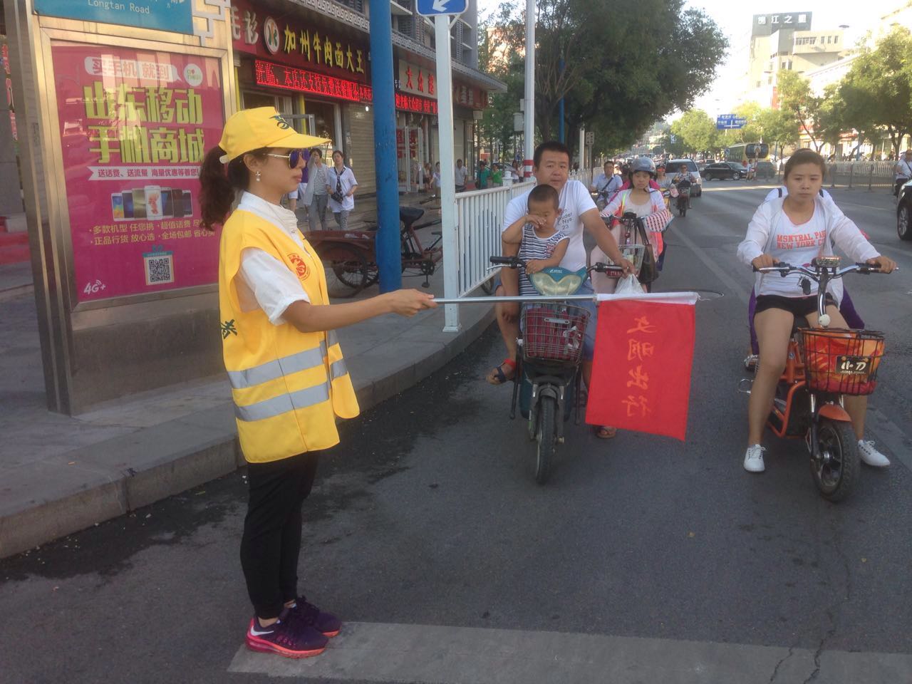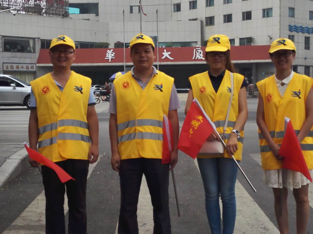 今天,是我校文明交通志愿者执勤的第一天,有8名文明交通志愿者分别于7:20-9:0017:00-18:30分两组在东岳大街与奈河东路路口执勤。今天上午7:10,第一组4名交通志愿者身着统一的黄马甲,头戴黄色太阳帽,手持交通指挥旗,开始上街引导交通。在接近两个小时的执勤过程中,4名教师中间未曾休息,冒着高温酷暑一直坚守岗位,尽职尽责,主动引导市民过马路走斑马线,不闯红灯,配合交警维护路口交通秩序,教育行人遵守交通规则。活动过程中,共劝阻闯红灯、越线等不文明交通行为60余起,积极向市民宣传交通法规80余次。