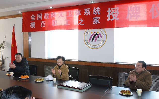 今天下午, 市教育工会王振凤主席、车西柱副主席到我校,代表全国总工会向泰安一中隆重授牌,授予我校全国教科文卫体系统模范职工之家荣誉称号,张勇华校长代表泰安一中接受了奖牌。
