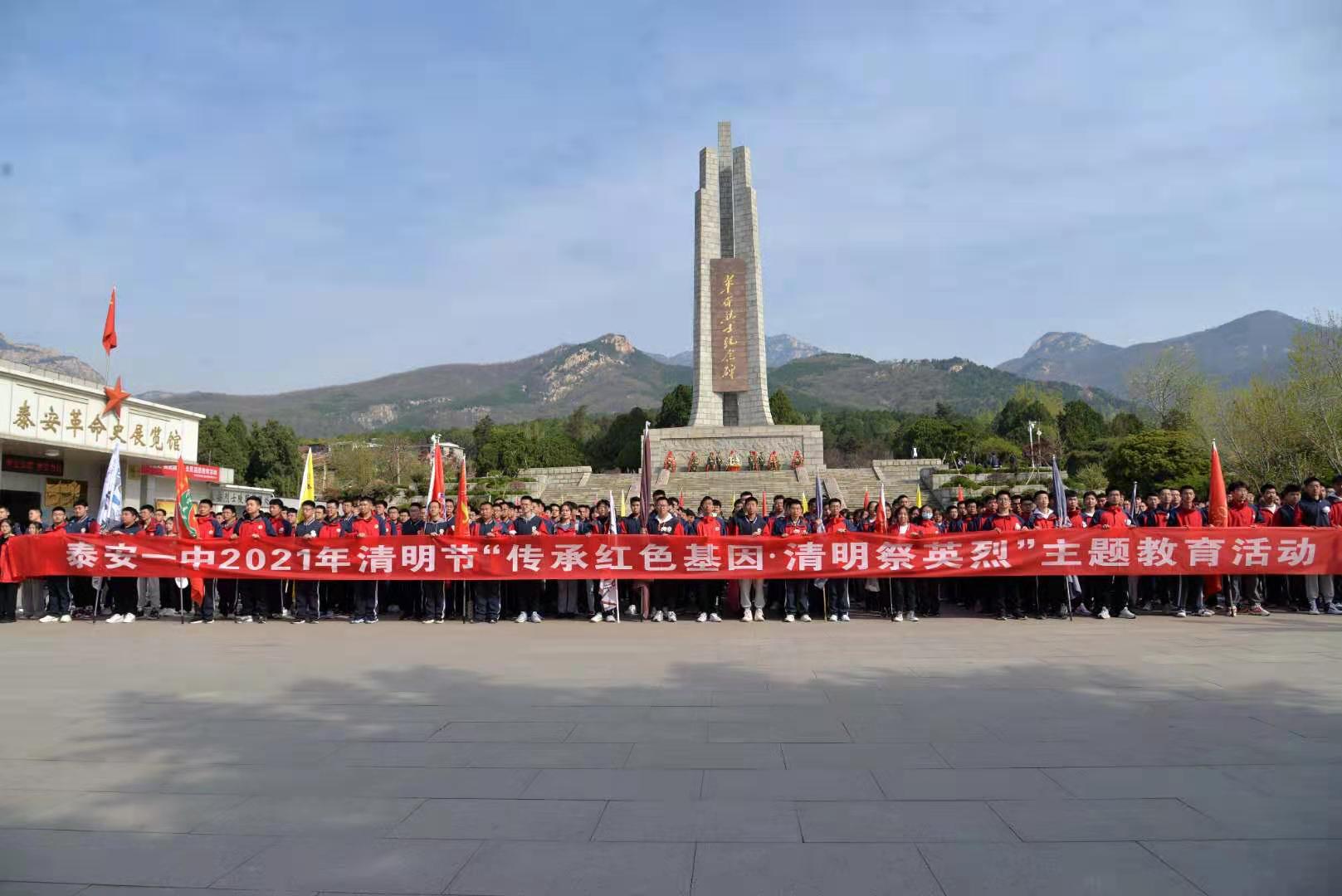 为迎接中国共产党成立100周年,引导未成年人慎终追远,缅怀先烈,继承革命先烈遗志,促进学校精神文明建设,2021年清明节之际,泰安一中组织学生到泰安革命烈士陵园开展了“传承红色基因•清明祭英烈”主题教育活动,清明节祭奠革命先烈活动已成为泰安一中多年来对学生进行思想道德教育的传统活动。